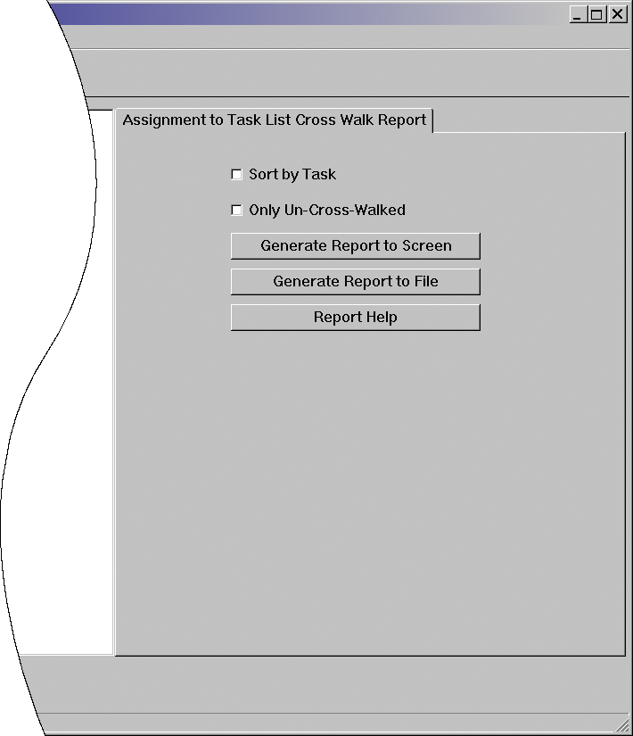 When checked as shown above with Sort by Task also unchecked, assignments that are not correlated to any tasks are listed. When checked with Sort by Task also checked, alignable tasks that are not cross walked to any assignments are listed. | ||||||||